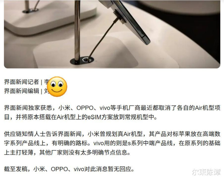 国产厂商们看得很透彻,一看到苹果的惨淡下场,立刻调整战略。据界面新闻报道,小米、OPPO、vivo 纷纷取消Air项目,把eSIM功能塞常规机型;荣耀虽然没取消相关项目,却特意不用 “Air” 命名。