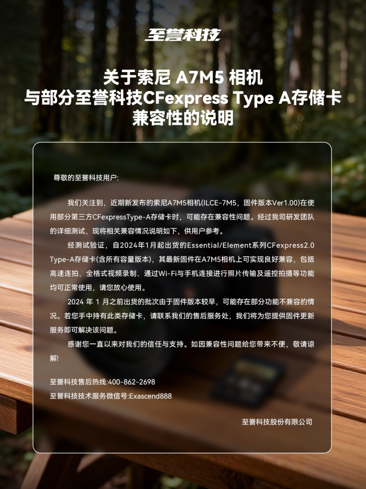 至誉将为持有“老固件”CFexpress2.0TypeA存储卡的用户提供固件更新服务。